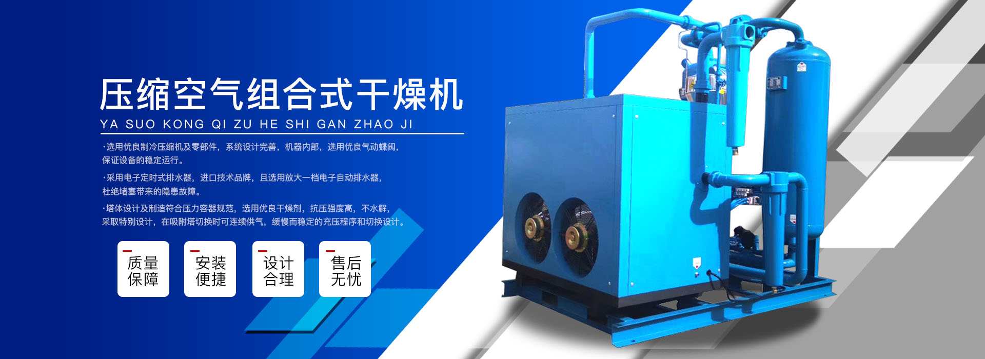 本公司系中國科學院、重鋼院、機電技術設計院、氣動技術研究所等相關專家合作的具有雄厚技術力量的高科技實體,是一個專業(yè)從事各種氣體干燥凈化及分離純化設備研究開發(fā)及推廣應用的高科技公司。公司積多年對壓縮空氣凈化設備的生產(chǎn)技術和銷售經(jīng)驗,并在消化吸收國外先進技術的基礎上,結合國內實際工況特點,研制出適合國內外廣大用戶的“滬盛”牌HSD系列壓縮空氣冷凍式干燥機、吸附式干燥機、后部冷卻器、預冷機組、工業(yè)用冷水機組和HF系列壓縮空氣高效精密過濾器(國產(chǎn)濾殼,美國漢克森HANKISON濾芯)等13大系列計300多種規(guī)格產(chǎn)品。并且新研發(fā)出燥式干器, 廣泛應用于電力、冶金、電子、機械、石油、化工、汽車制造、紡織、化纖、輕工、造紙、橡膠、儀表、食品、空氣、卷煙、生物、醫(yī)藥、日化等行業(yè),在國內同行業(yè)中一直處于領先地位。